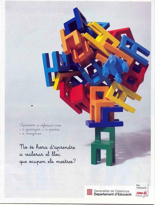 El procés de preinscripció i matricula escolar, aquest any ha anat acompanyat d'una publicitat basada en la imatge de cadiretes escolars de colors (campanya "Per l'educació som-hi"). Entre aquesta publicitat sobresurt una que diu: No és hora d’aprendre a valorar el lloc que ocupen els mestres?. No seré jo qui desvalori als mestres, tot el contrari però si que us convido a observar la imatge. La cadira que sosté la resta (unes 25 cadiretes) és de color verd i la resta de cadires que suporta la cadira verd en un exercici impecable d’equilibrisme i de psicologia del color: són almenys de 6 colors diferents i cap de color negre!. Em tranquil•litzo. Són el reflex, dedueixo, de la multiculturalitat a l'aula i diferències personals i socials.
