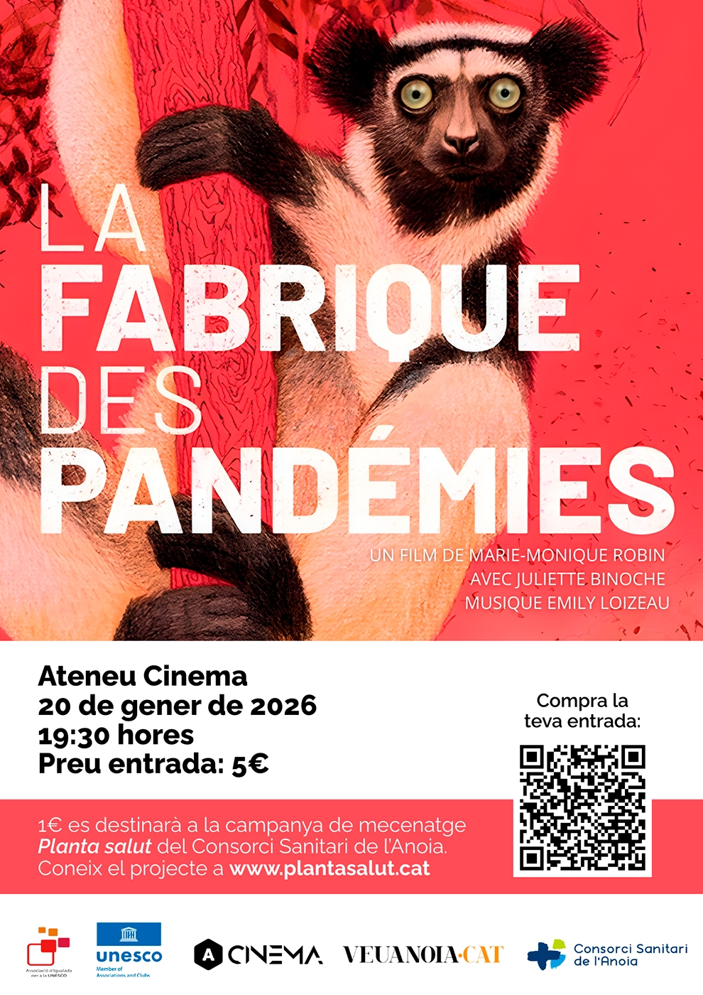 L’Ateneu Cinema d’Igualada acollirà la projecció del documental francès La fàbrica de pandèmies (La fabrique des pandémies), una proposta cinematogràfica que analitza la relació entre la destrucció dels ecosistemes, la pèrdua de biodiversitat i l’aparició de noves epidèmies. El film, dirigit per la periodista francesa Marie-Monique Robin i amb la participació de l’actriu Juliette Binoche, es projectarà el dimarts 20 de gener, a les 19:30 h