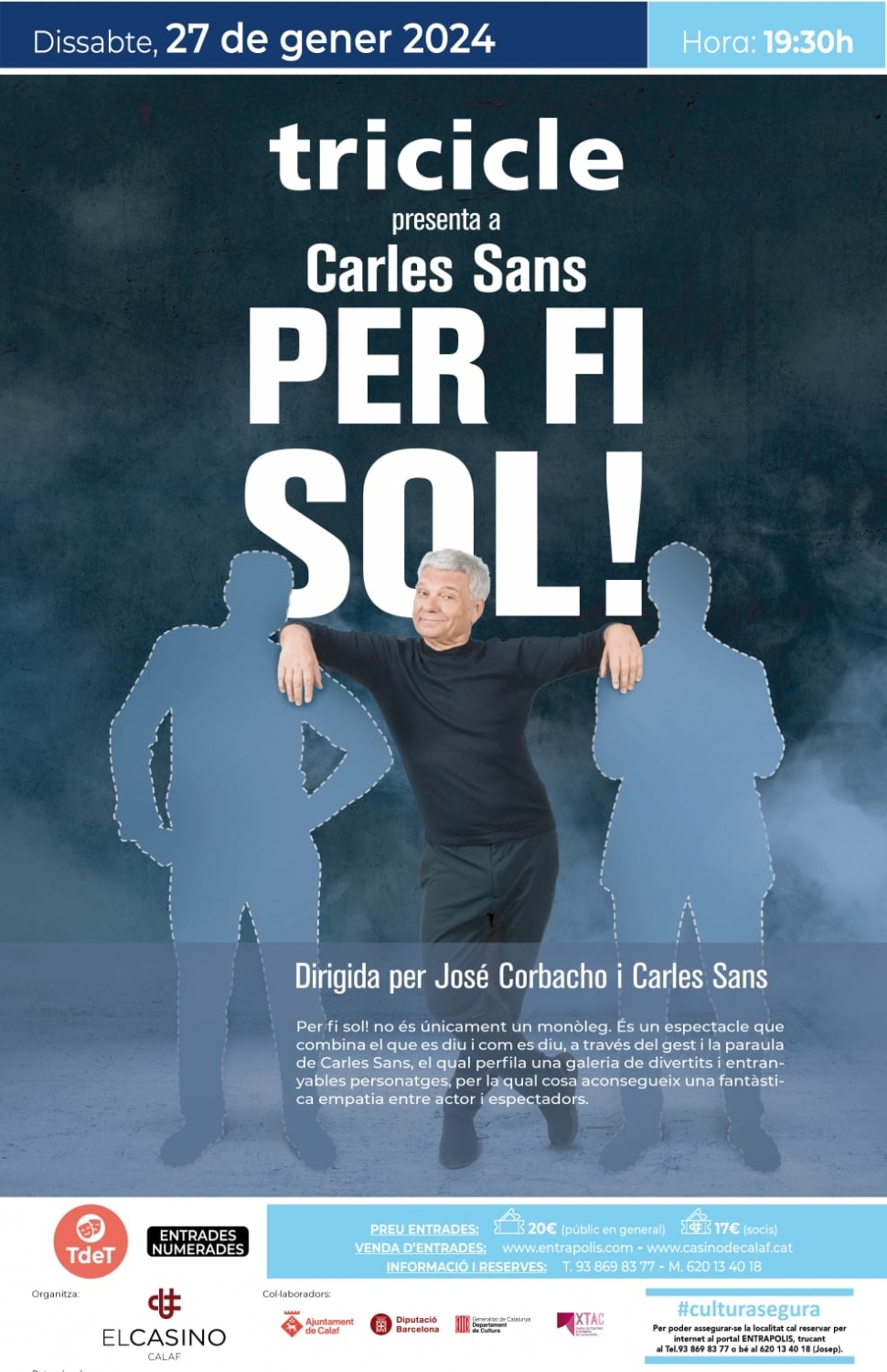 Aquest dissabte 27 de gener a les 19.30 h, el tricicle presenta a Carles Sans amb l’espectacle ‘Per fi sol’ al Casino de Calaf. L’artista explicarà les divertides anècdotes viscudes durant tants i tants anys amb el tricicle en un espectacle que demostrarà ser molt més que un monòleg.
