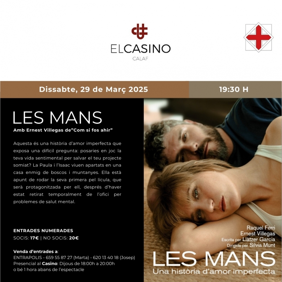 El Casino de Calaf acollirà el dissabte 29 de març a les 19:30h la representació de Les Mans, una intensa i emotiva obra protagonitzada per Raquel Ferri i Ernest Villegas, conegut pel seu paper a la sèrie de TV3 "Com si fos ahir". Escrita per Làtzer Garcia i dirigida per la reconeguda cineasta Sílvia Munt.
