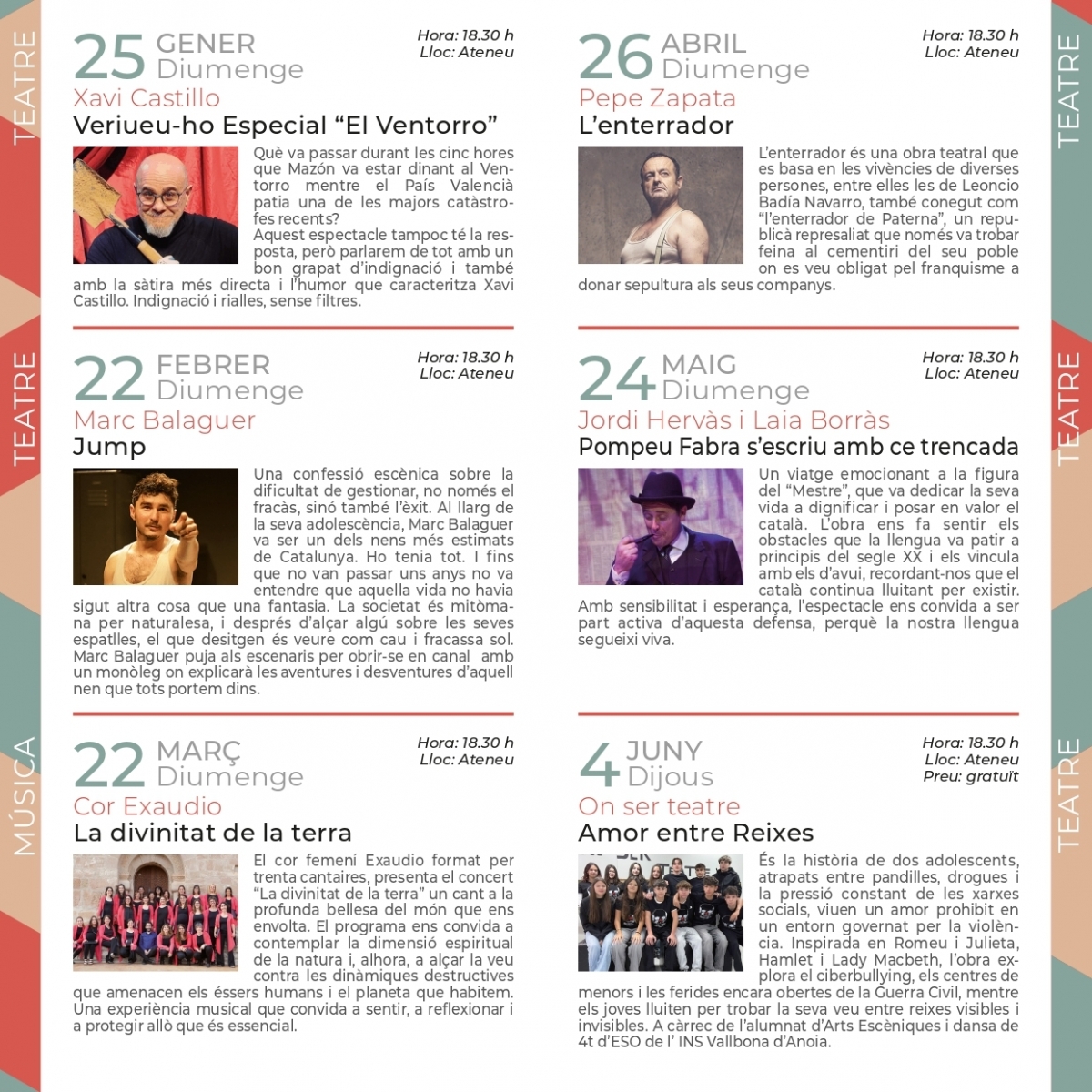 Diumenge 25 de gener: Veriueu-jo Especial El Ventorro", amb Xavi Castillo. Un espectacle de sàtira punyent que denuncia la mala gestió política i institucional davant de crisis humanes i mediambientals, utilitzant l'humor, la indignació i la ironia com a eines de conscienciació.