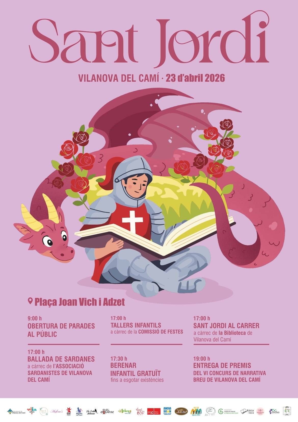 La diada de Sant Jordi a Vilanova, tindrà com a centre neuràlgic la plaça Joan Vich i Adzet; la jornada festiva començarà a primera hora del matí amb l'obertura oficial de les parades de llibres i roses al públic. La jornada comptarà amb la participació activa les entitats i associacions com Anoia Down, la Gent del Camp del Rei, Bigotis del Camí i les AFA de les escoles Marta Mata i Joan Maragall. També hi seran presents entitats solidàries com l’Associació Espanyola Contra el Càncer i de representació política com el PSC Vilanova del Camí.
