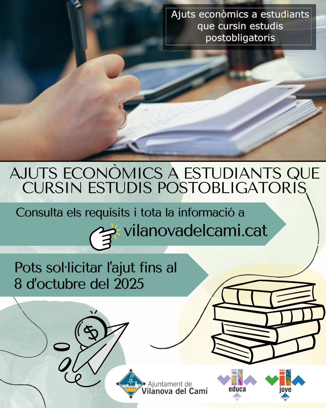 L’Ajuntament de Vilanova del Camí ha obert una nova convocatòria d’ajudes econòmiques per als joves del municipi que cursen estudis postobligatoris fora de Vilanova.