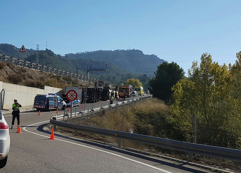 Aquest matí de dimarts, poc abans de 2/4 de 12, un camió bolcava a l'enllaç de la C-15 amb l'autovia A-2, al terme municipal d'Òdena. Hi ha diverses dotacions dels Mossos i Bombers per pacificar el trànsit a la zona. El vehicle, que transportava cartrons per reciclar, ha bolcat per causes que es desconeixen al punt on hi ha el carril d'incorporació a l'Eix Diagonal. El conductor ha pogut sortir del vehicle sense ferides de consideració. Els efectius desplaçats estan esperant l'arribada d'una grua de gran tonatge per retirar el vehicle.