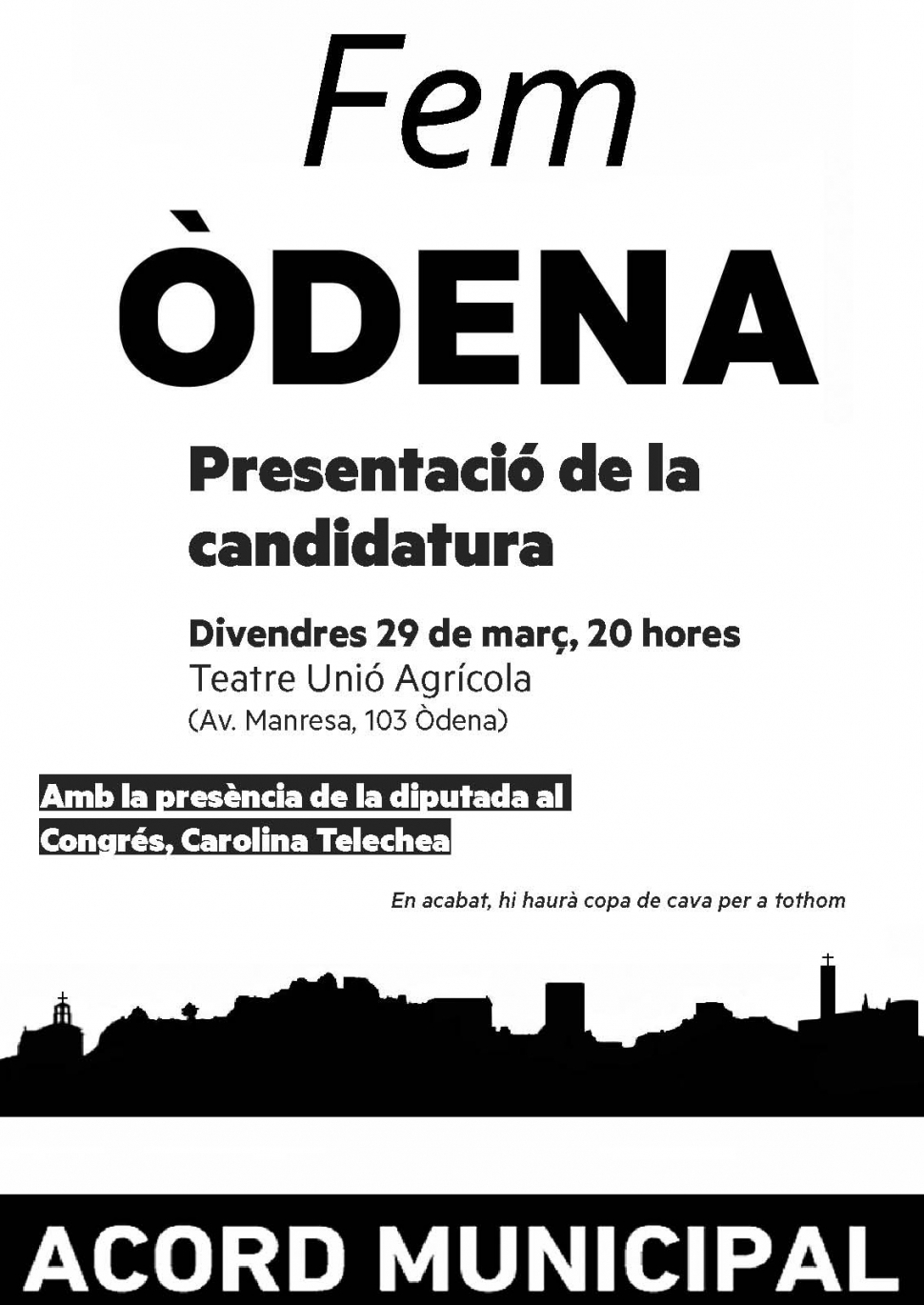 La flamant candidata al Congrés i diputada el darrera any a Madrid, Carolina Telechea, acompanyarà a l'equip de Fem Òdena AM en la seva presentació. La candidatura a l'alcaldia d'Òdena l'encapçala Maria Sayavera, regidora republicana al municipi des de 2011.