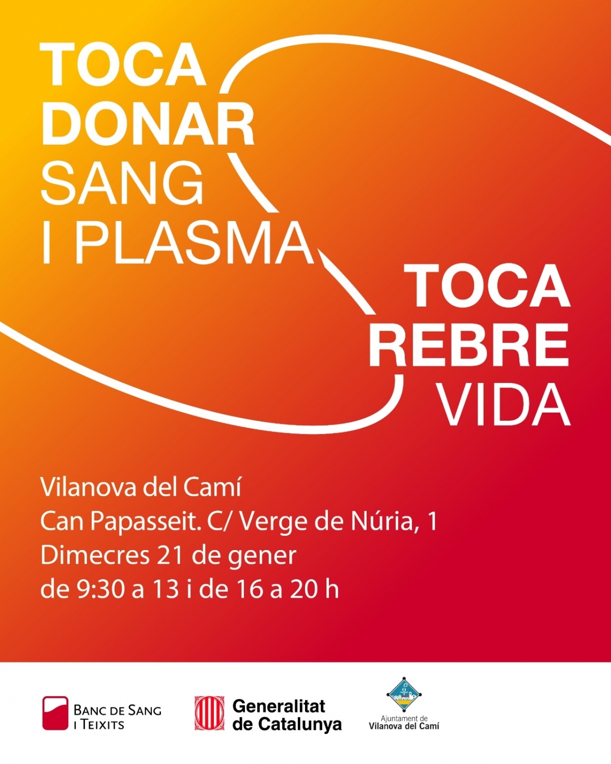 Vilanova del Camí celebrarà el primer acapte de sang i plasma de l’any el proper dimecres 21 de gener a l’equipament municipal de Can Papasseit. La jornada, organitzada pel Banc de Sang i Teixits amb la col·laboració de l’Ajuntament, tindrà lloc en horari de matí, de 9.30 a 13 h, i de tarda, de 16 a 20 h, amb l’objectiu de facilitar la participació del màxim nombre de veïns i veïnes.