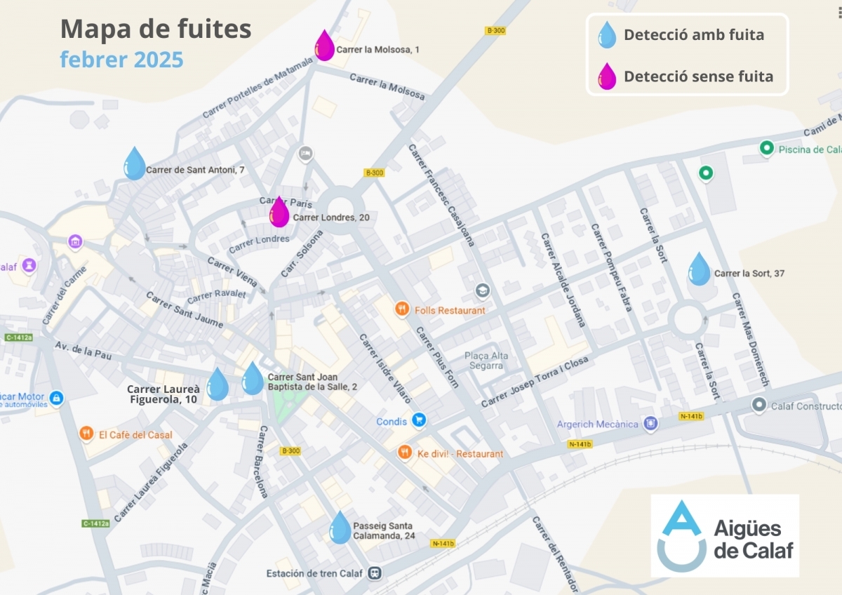 En total s'han localitzat i reparat fins a cinc fuites ubicades al carrer Laureà Figuerola, Sant Antoni, Sant Joan Baptista la Salle, La Sort i el passeig Santa Calamanda. D'altra banda, també es van fer prospeccions al carrer Londres i al carrer Molsosa sense trobar-hi finalment cap fuita.