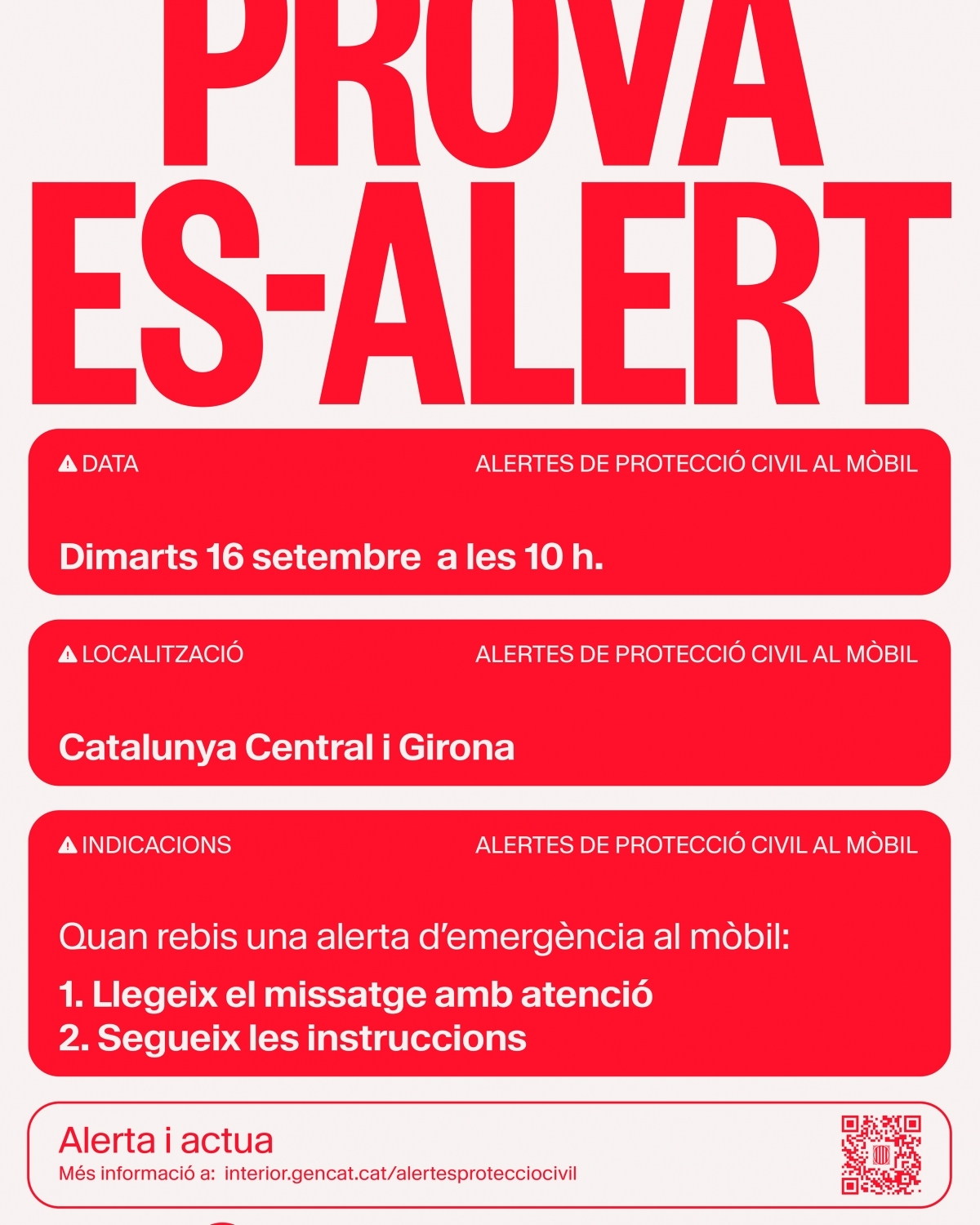 Aquest dimarts, 16 de setembre, a les 10 del matí, tots els telèfons mòbils intel·ligents que es trobin a les vegueries de Girona i Catalunya Central rebran un missatge de prova del sistema d’alertes de Protecció Civil.