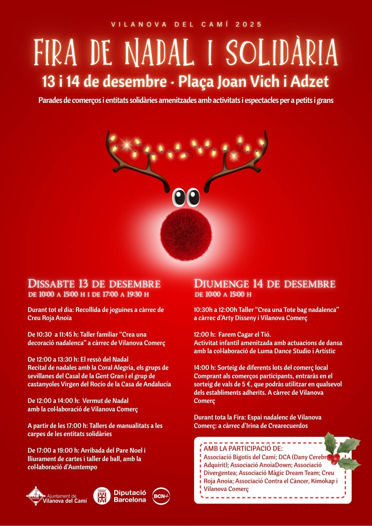 La fira obrirà portes dissabte, 13 de desembre, en horari de 10.00 a 15.00 h i de 17.00 a 19.30 h. Durant tota la jornada es durà a terme una recollida de joguines organitzada per la Creu Roja Anoia. Al matí s’oferirà un taller familiar de decoració nadalenca impulsat per Vilanova Comerç, així com el recital El ressò del Nadal, que comptarà amb la participació de la Coral Alegria, els grups de sevillanes del Casal de la Gent Gran i el grup de castanyoles de la Casa de Andalucía.