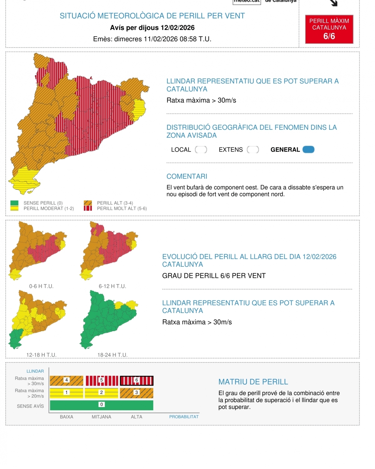 Segons ha dit Segalà, l'episodi tindrà dos màxims, el primer serà aquest dijous amb el vent que arribarà a totes les comarques de Catalunya "sense excepció" i el segon serà dissabte. Les ratxes de vent que han començat aquest dimecres han arribat als 140 km/h en zones com el Vallès Oriental o 115km/h. Ja s'ha emès avisos de perill de graus 5 i 6 perquè s'esperen ratxes de més de 90 i 100 km/h durant l'episodi. La ventada, ha remarcat, afectarà tot Catalunya amb més o menys mesura.