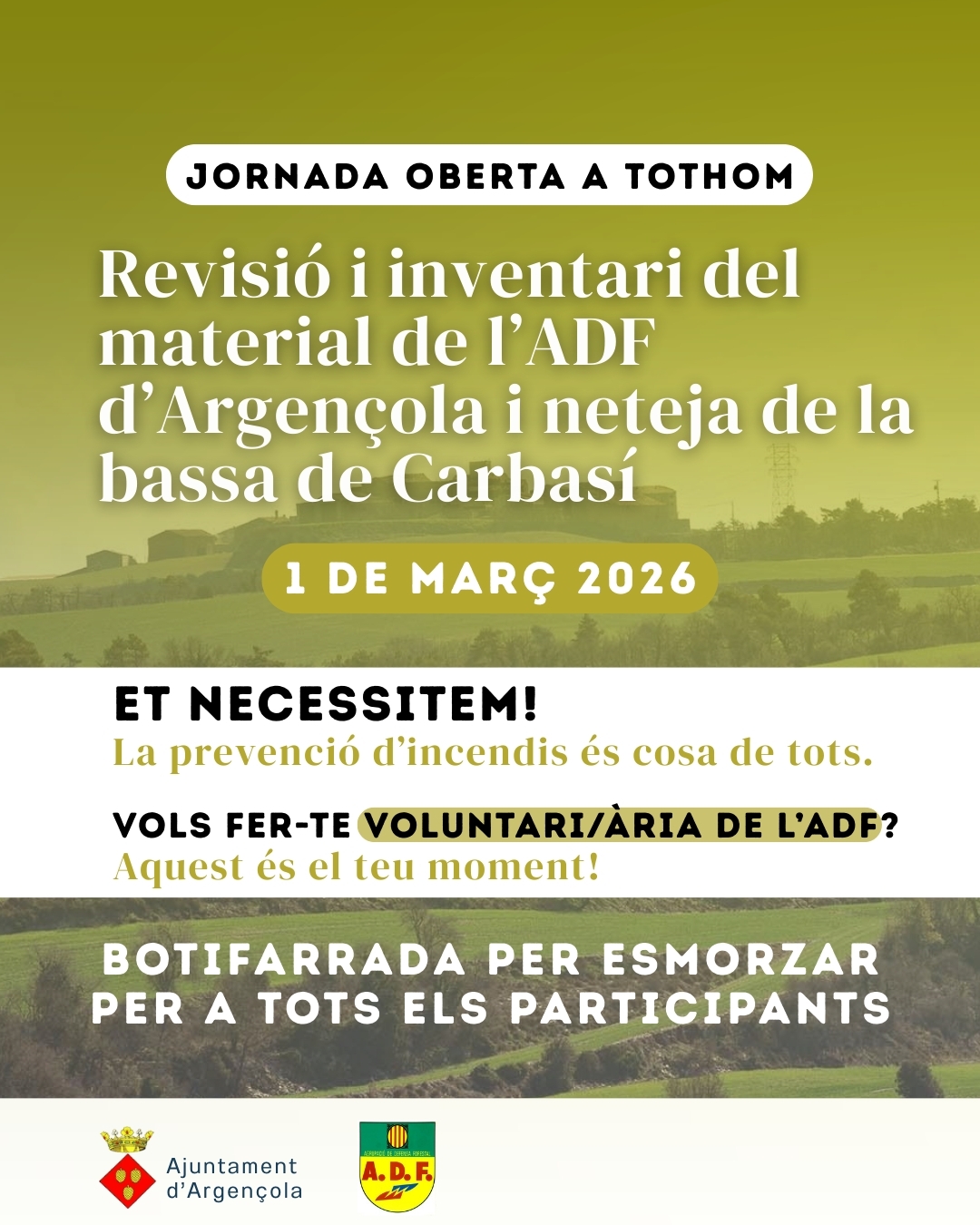 L’Ajuntament i l’ADF d'Argençola organitzen el proper 1 de març una jornada oberta a tota la ciutadania amb l’objectiu de revisar i fer inventari del material de prevenció i extinció d’incendis de l’ADF, així com dur a terme tasques de neteja i manteniment de la bassa de Carbasí, un punt d’aigua estratègic per a la prevenció i l’extinció d’incendis forestals al municipi.