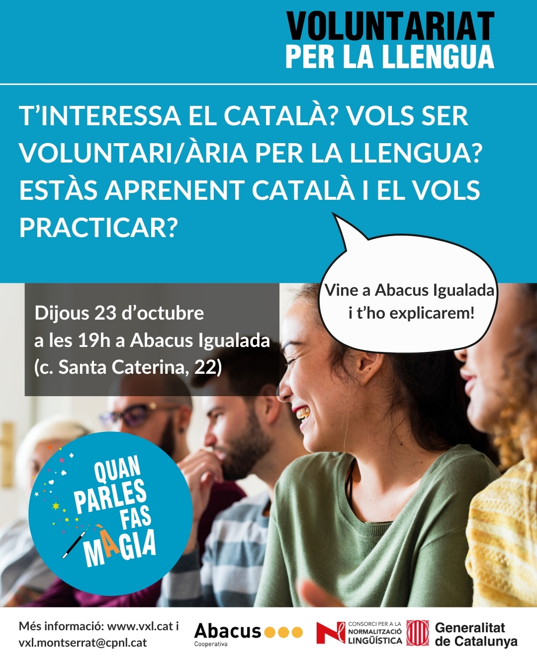 Les inscripcions es poden fer a www.vxl.cat, al 634 757 868, vxl.montserrat@cpnl.cat o al Servei de Català d’Igualada al Centre Cívic Nord.