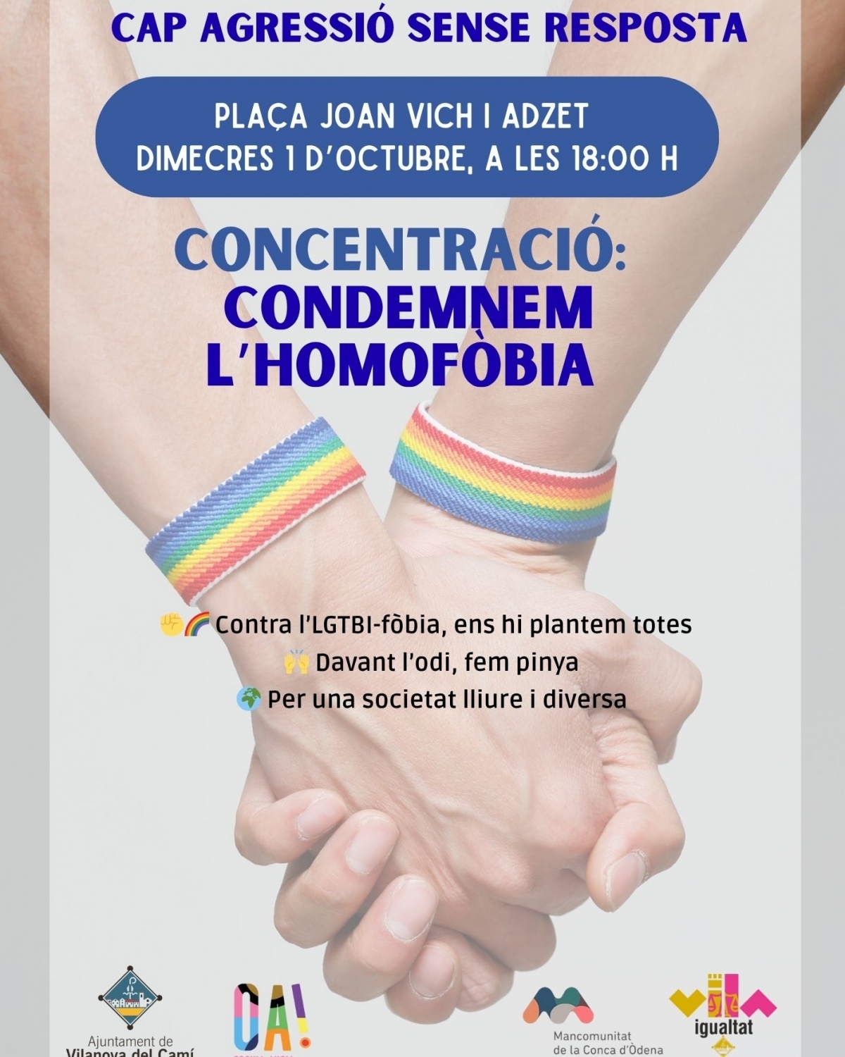 L’Ajuntament de Vilanova del Camí, l’entitat Orgull Anoia i la Mancomunitat de la Conca d’Òdena han convocat, per aquest dimecres a les sis de la tarda, una concentració a la plaça Joan Vich i Adzet per rebutjar l’agressió homòfoba que va tenir lloc aquest cap de setmana a Igualada.